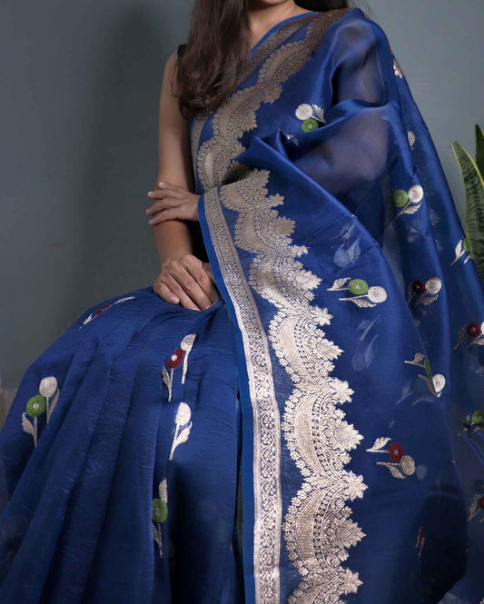 Navy Blue Pure Handloom Kora Silk Banarasi Saree